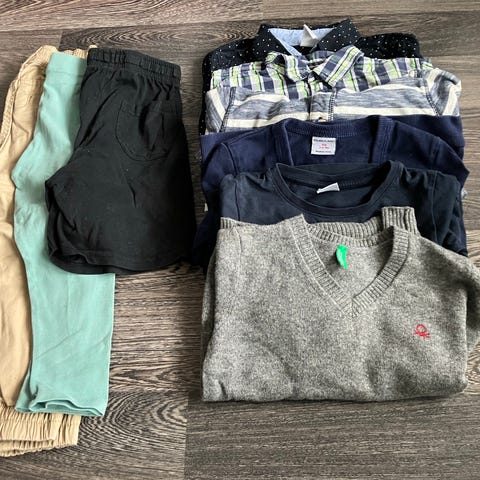 Lähes kaikki uutena meille ostettuja, yhdellä olleet käytössä. Hyviä ja siistejä perusvaatteita arkeen. Ei risoja tai tahraisia, peruskäytöstä syntynyttä kulumaa löytyy.