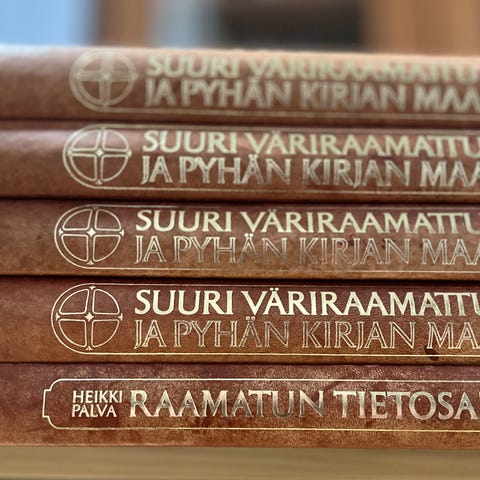 Suuri väriraamattu -kirjasarja. Teoksissa on raamatuntekstiä ja runsaasti värikuvitusta. Selkämyksissä teksti "Suuri väriraamattu – Pyhän kirjan maa". Sopii raamatuntutkimukseen ja yleiseen lukemiseen sekä kuvitetuksi tietolähteHreksi Raamatun maista ja tapahtumista. Hinta 15 €/kirja.