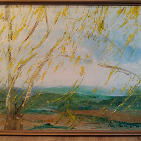 Siinä ois myynnissä maalaus. Sain joskus porukoilta, joten ei ole paljoa kertomista maalauksesta. Mitat: 120x120 ja 3cm paksu