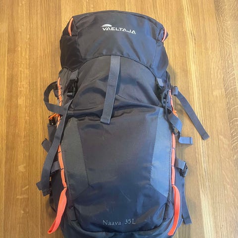 Ruskea reppu, jossa useita vetoketjullisia taskuja ja säilytyslokeroita. Repussa on pehmustetut olkahihnat ja kevyt lantiovyö Sopii esimerkiksi retkeilyyn tai muuhun ulkoiluun, kun tarvitaan tilavaa kantoratkaisua varusteille ja tarvikkeille.