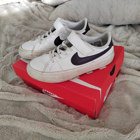 Pojalle pieneksi jääneet Niken Court borough tennarit. Aidot, ostettu Intersportista, laatikko ei tallessa. Täysin ehjät päältä ja sisältä, vasemmassa kengässä mustaa jälkeä joka varmaan lähtis pesemällä.
