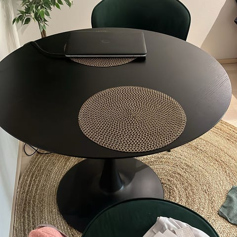 Jysk ruokapöytä, pyöreä malli. Pöydän kansi on puunvärinen ja jalat mustat.