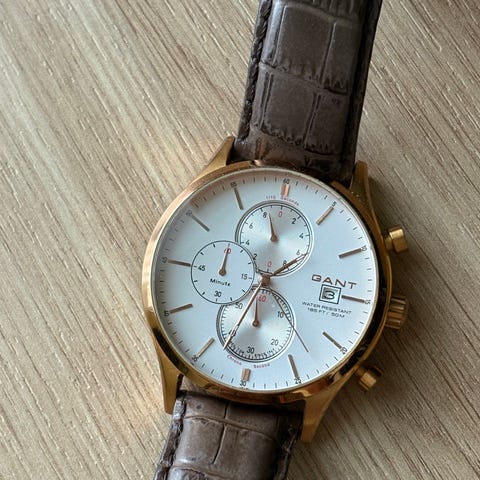 Gant miesten rannekello. Kellossa on valkoinen analoginen kellotaulu ohuilla tunti- ja minuuttiviivamerkinnöillä sekä erillinen pikkusekuntitaulu. Rungon ja rannekkeen materiaali on terästä, ja rannekkeessa on teräksinen linkkirakenne sekä lukitusmekanismi. Kello sopii miehille arki- ja juhlakäyttöön.