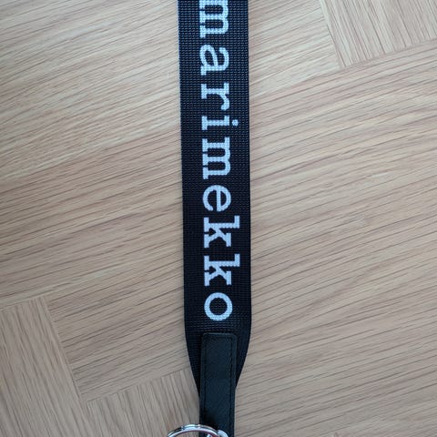 ”Kaukana-vyö on valmistettu nailonista Unikko-kuosilla. Vyössä on metallinen solki, jossa on Marimekko-logo.”