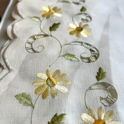 Myydään verho, jossa vihreällä pohja on valkoisia kukkia. Verho on 100% puuvillaa.