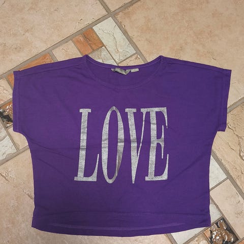 H&M t-paita tytöille, koko 134 cm. Violetti väri ja edessä painettu kuviointi tekstillä. Lyhythihainen malli, pyöreä pääntie. Materiaali 100 % puuvillaa. Sopii arki- ja vapaa-ajan käyttöön lapselle, jonka pituus on noin 134 cm.