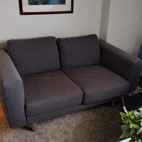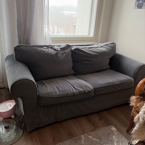 Vaaleanharmaa siisti, pieni ja kevyt sohva. Valkoinen metallirunko. Vetoketjuilla kiinni oleva päällinen. Tuodaan Tampereelle.