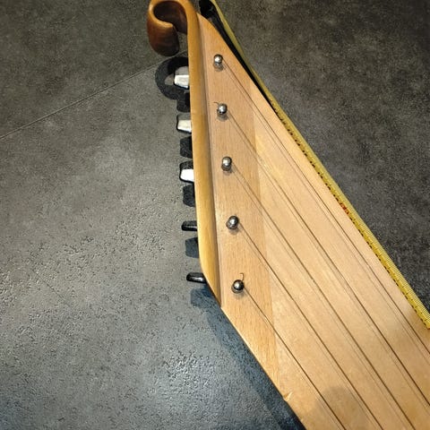 Kantele. Ei halkeamia. Puutappi viritteinen. Yhdestä tapista pieni pala pois. Ei haittaa viritystä. Yksi kieli poikki