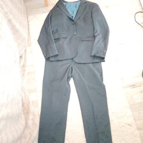 Jeffrey Banks miesten puku, koko 54. Harmaa sävy, jossa hillitty kuviointi. Materiaali 100 % villa. Mukaan toinen takki. Hyvässä kunnossa, arvioisin että sopii parhaiten noin 185-190cm +90kg käyttäjälle.