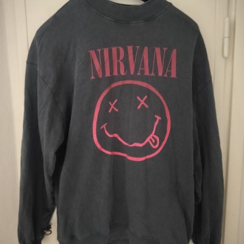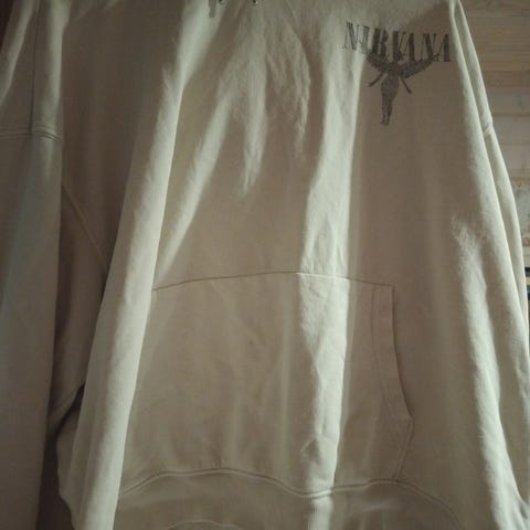 Myydään valkoinen Nirvana-huppari. Teksti edessä, takana ja hupussa. Koko L.