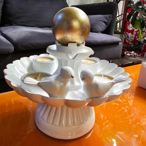 Koristevesiputous Partylite P90159 Musta jonka takana on paikka pienelle kynttilälle (mukaan tulee pieni lasi) Sopii sisäkäyttöön esimerkiksi hyllylle tai pöydälle sisustuselementiksi. Materiaalista en ole ihan varma, mutta läpinäkyvä osa on lasia. Sähköllä toimiva pumppumekanismi kierrättää vettä altaasta ylös ja alas vesipintaa pitkin. Aika painava n. 7kg. Muutama alkuperäinen kivi on vielä jäljellä, mutta sopii vaikka puutarhakaupasta ostetut. Meillä vaaleat ja saa halutessaan mukaan ei näy kuvissa, ku testattiin että varmasti toimii kun ei ole ollut päällä pitkään aikaan.