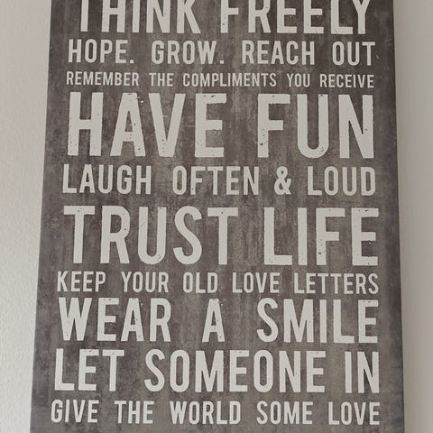 Sisustustaulusetti, jossa kaksi suorakulmaista tekstitaulua. Molemmissa tauluissa on harmaan sävyinen tausta ja valkoisella painettuja englanninkielisiä elämänohjeita ja lauseita. Taulut sopivat seinälle ripustettavaksi esimerkiksi olohuoneeseen, eteiseen tai työtilaan tuomaan graafista ilmettä ja tekstipainotteista sisustusta.