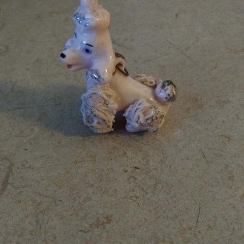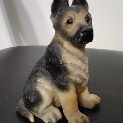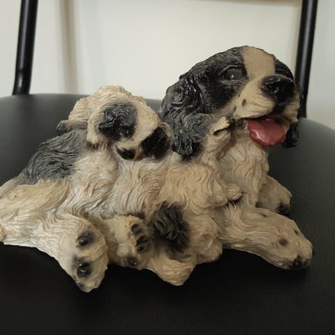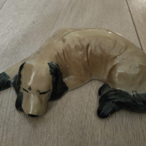 Posliinikoira makaa korissa.