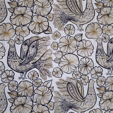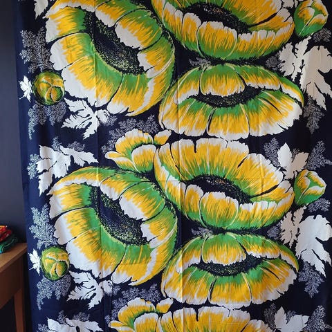 Ihanan raikas 1970-luvun puuvillakangas, missä kukkivat juhannusruusut. Harvinainen löytö. Pirkko on paremmin tunnettu Kuukivet kuosistaan.