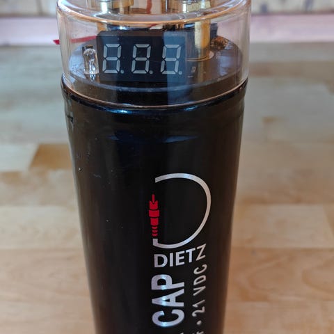 Autostudio CAP-1R kondensaattori 1 farad autokäyttöön. Laitteessa on digitaalinen jännitenäyttö ja kaksi kaapeliliitäntää yläosassa. Tarkoitettu autohifijärjestelmän virtapiikin tasaamiseen ja jännitteen vakauttamiseen vahvistimille. Mukana rungossa kiinnityspanta asennusta varten.