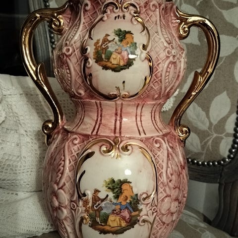 Kaksikahvainen keramiikkamaljakko, jossa on koristeellisia kultaisia yksityiskohtia, lintu ja kukka-aiheita. Valmistettu Kreikassa ja koristeltu 24 karaatin kullalla.