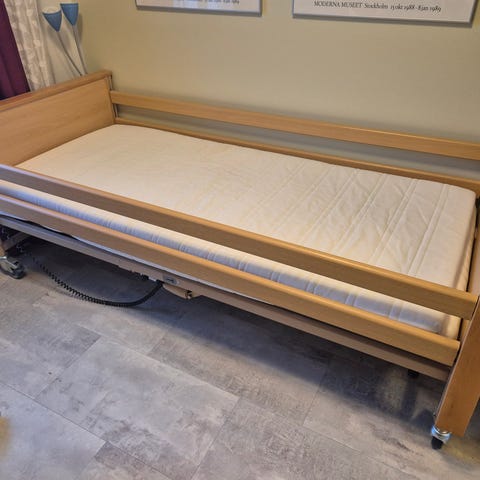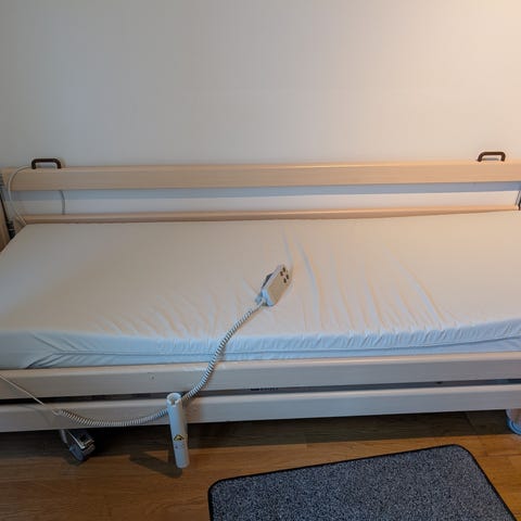 Tässä on sähkösäätöinen hoitosänky, joka on valmistettu puusta ja metallista. Sänky on varustettu pyörillä, joten sitä on helppo liikutella.Varustettu laadukkailla Linakin harjattomilla sähkömoottoreilla, kaikki toiminnot testattu ja toimii.