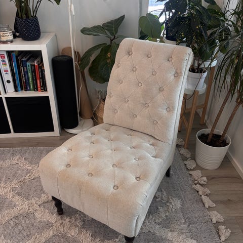 Hakusanat: puukäsinojat, Tuoli, mukava, tuolit, käytetyt huonekalut, vintage, vintage huonekalut, retro, korkea selkänoja, istuin, tummat käsinojat, sisustus, nojatuoli, nojatuolit, lepotuoli, valkoinen, huonekalu, verhoilu, huonekalut, klassinen, niskatyyny