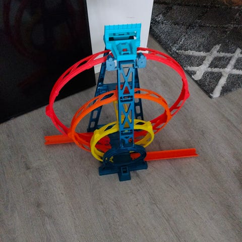 Useita radan osia, suoria oransseja ratoja, sinisiä rataelementtejä, iso kuljetusauto sekä haita esittävä rataosa. Mukana on myös moniosainen torni, joka avautuu kilparadaksi.