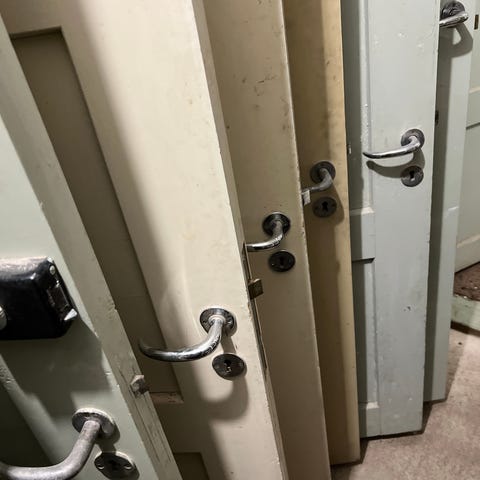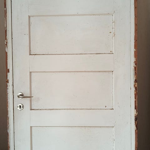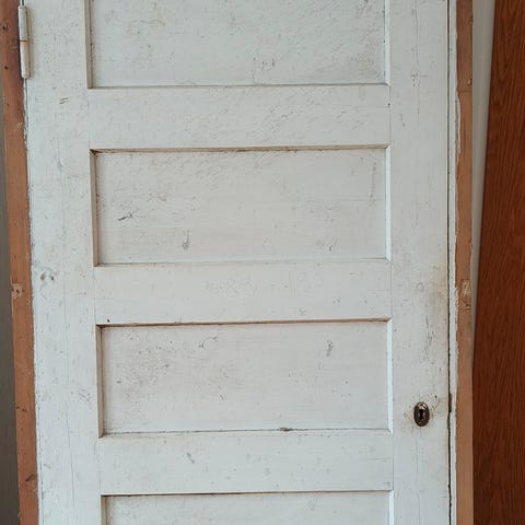 Vanha peiliovi jossa yläosassa lasi ja alhaalla kolme umpipaneelia. Karmin ulkomitat ovat noin 94 x 210 cm. Ovi soveltuu sisäoveksi tiloihin, joissa halutaan valoa kulkeutuvan lasiaukon kautta. Ovi on varustettu metallisella painikkeella ja lukkopesällä, saranoilla