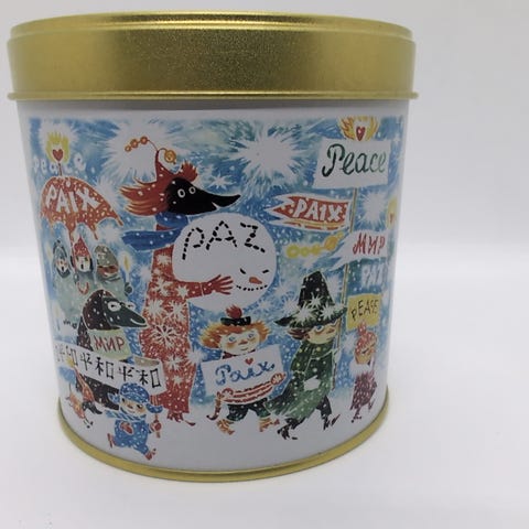 Purkki on sinisävyinen ja siinä on Muumi-hahmoihin perustuva kuvitus purkin kyljissä ja kannessa.