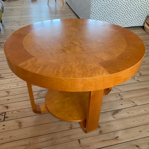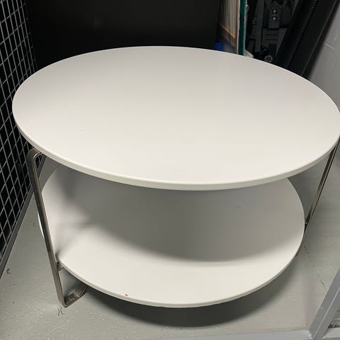 Pyöreä valkoinen sohvapöytä. Halkaisija 90cm. Pientä kulumaa reunoissa, mutta yleisilme siisti. Saa halutessaan paikattua pienellä maalauksella tmv.