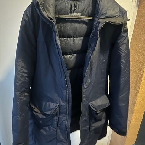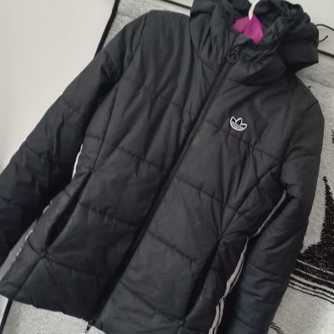 Adidas naisten talvitakki, koko XS. Pitkä, musta toppamallinen takki, jossa huppu. Materiaalina polyesteri. Hihassa Adidas-logo. Takin ja hupun sisäpuolella kiristysnyöri istuvuuden säätöön. Menee S-kokoiselle.