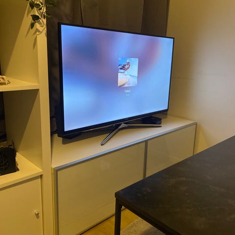 Samsung televisio. Näytössä tasainen kuva, mukana kaukosäädin. Soveltuu televisio-ohjelmien ja muun kuvasisällön katseluun kotikäytössä. Lisätiedot, kuten tarkka koko, malli ja liitännät, eivät käy ilmi kuvista.