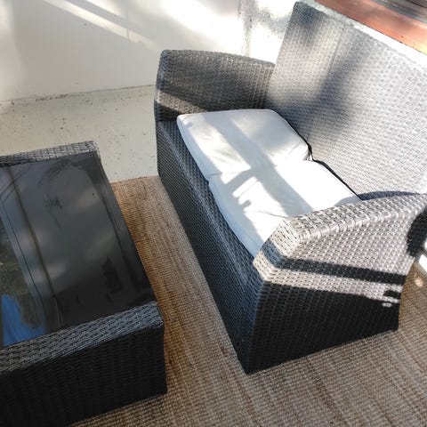 Myydään 3:n istuttava parvekedivaanisohva ja -sohvapöytä. Hyvässä kunnossa, divaaniosan saa irroitettua, jolloin voi myös käyttää kahtena ”sohvana”. Kätisyyttä ei pysty vaihtamaan. Tämä on muutaman vuoden vahva ja muuton vuoksi myydään. En syynännyt mahdollisia tahroja, pesu jää nyt ostajalle. Pesty pari vuotta sitten tekstiilipesurilla ja taannoin imuroitu. Ollut vain lasitetulla parvekkeella! Mitat: Leveys 210cm, istuinsyvyys 70cm ja divaanin syvyys 140cm