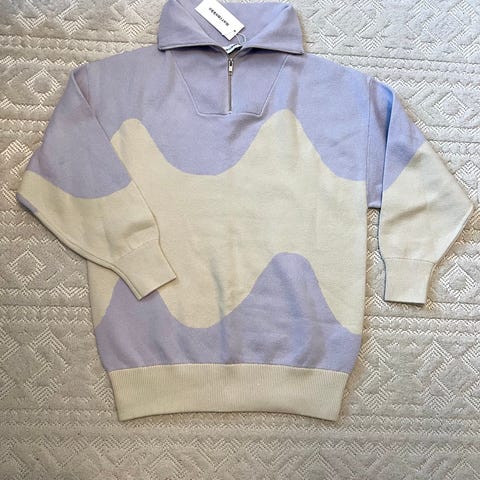 Marimekko opaakki unikko villaneule, koko ollut XL mutta kutistunut pesussa kokoon S/M. Neule ei ole myöskään enää niin pehmeä kuin uutena. Sivuilla olevissa halkioissa on myös venymää.