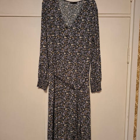 H&M mekko, naisten koko XL. Materiaalina puuvilla. Malli on väljä ja pitkä, vyötäröllä on kiristettävä nyöri ja kuminauhayksityiskohdat nätisti vyötäröllä. Hihat ovat pitkät ja hihansuissa on kumpparit. Malli on päällä imarteleva ja sopii hyvin rintavallekin. Mittailen jos tarve.