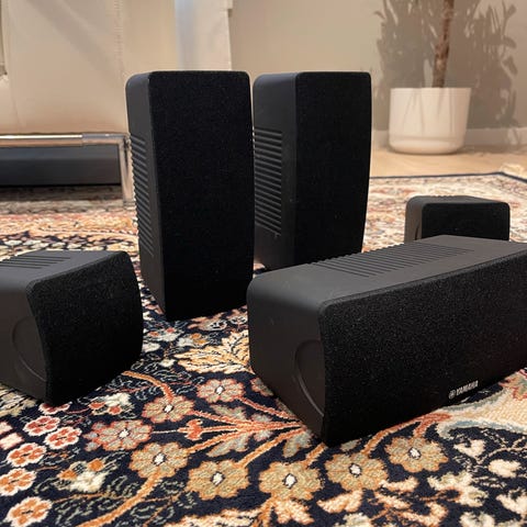 Suoraan käytöstä toimiva ja hyvin soiva kotiteatterisetti. Kuvat kannattaa katsoa kaikki läpi. Pientä käytön jälkeä, subbarissa näkyy eniten jälkeä ja siitä on päältä lisäkuva. Kaiuttimien johdot on piilotettuna seinien välissä joten niitä ei saatavilla mukaan. Virtajohdot ja kaukosäädin on.