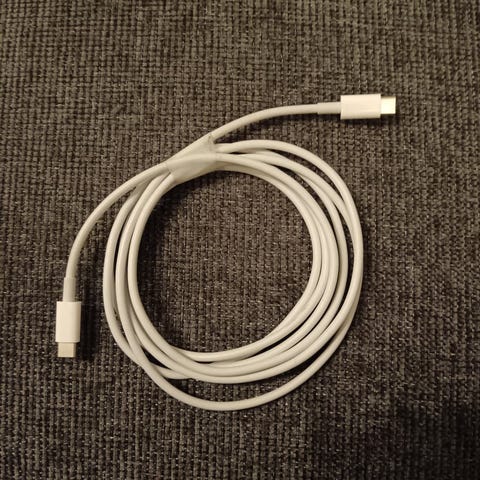 Parin metrin pituinen punottu kaapeli lataukseen, synkronointiin ja datan siirtoon. Latauskaapelin kummassakin päässä USB-C-liitäntä. Tukee peräti 240 W:n latausta sekä pikalatausta.