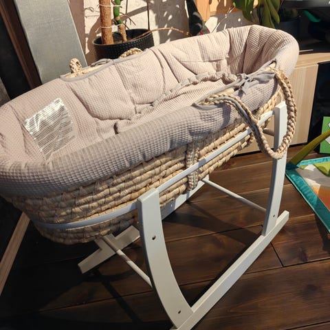 Mukana tulee patja (käytetty aina kosteussuojaa), reunapehmuste, 2kpl muotoonommeltuja aluslakanoita sekä kiinnitysliina (sängyn saa kiinnitettyä vanhempien sänkyyn).
