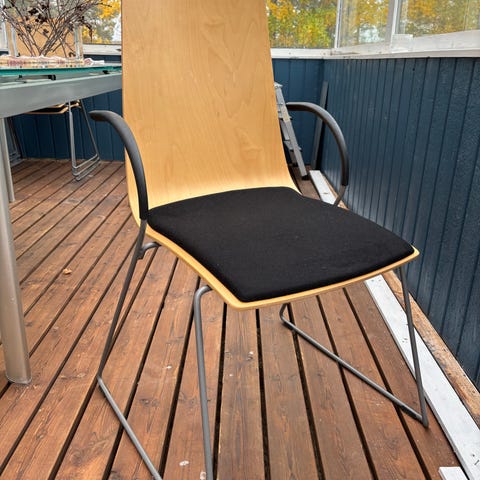 Ruuvit kaipaavat kiristämistä. Kunnostajalle tai näin käyttöön. Tukevat , puiset ja ajattomat tuolit.