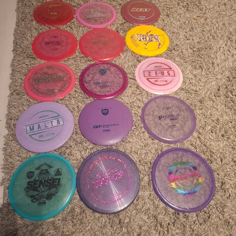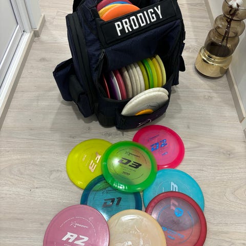Frisbeegolfsetti, johon kuuluu useita frisbeegolfkiekkoja sekä frisbeegolfreppu. Kiekoissa on eri malleja ja painatuksia, ja ne soveltuvat erilaisiin heittoihin radalla. Mukana tuleva reppu on suunniteltu frisbeegolfkiekkojen kuljettamiseen ja säilyttämiseen, ja siinä on useita lokeroita ja taskuja varusteille. Setti sopii frisbeegolfin harrastamiseen ja harjoitteluun.