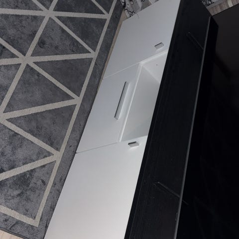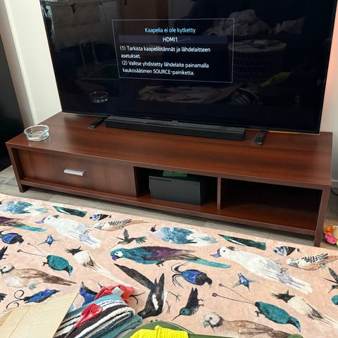Hyvänkuntoinen musta tv-taso (kiiltävä pinta).