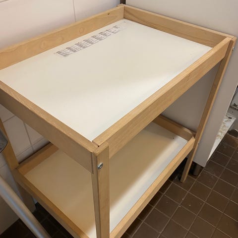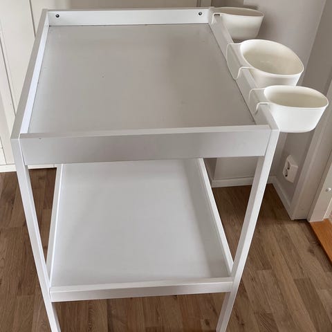 Hoitopöytä laatikoilla. Hoitotason saa nostettua ylös, jolloin toimii erinomaisesti lipastona. Olen maalannut hoitopöydän vaalean harmaalla kalkkimaalilla ja maalipinta on ajan saatossa ottanut hieman osumaa, katso tarkemmat kuvat.