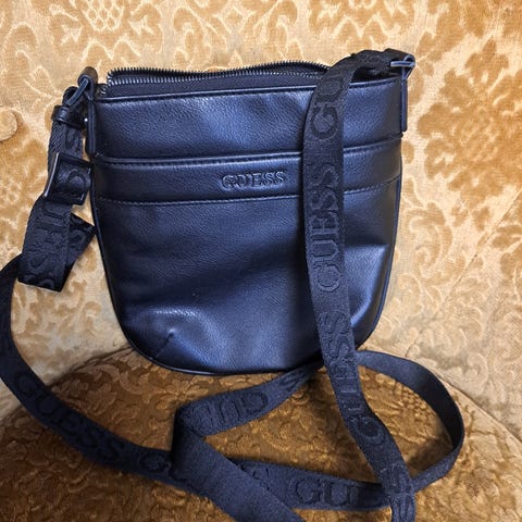 Guess musta olkalaukku. Käytetty, hyvässa kunnossa. Saa käyttä molemapuolisena, toinen puoli ihana kuviollinen. Mukana myös pieni raha/kosmetiikan pussi vetoketjulla ja saa kiinnitää laukkuun. Olkalaukun mitat k 25cm, l 35cm ja 12cm. Pieni laukku l 25cm ja k 15cm. Nouto Länsi-Pasila tai postitse, osta maksaa postikulut.