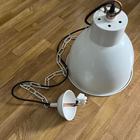 Suloinen pieni kattovalaisin valkoisesta lasista. Läpimitta 17cm, korkeus johtoon asti 14cm