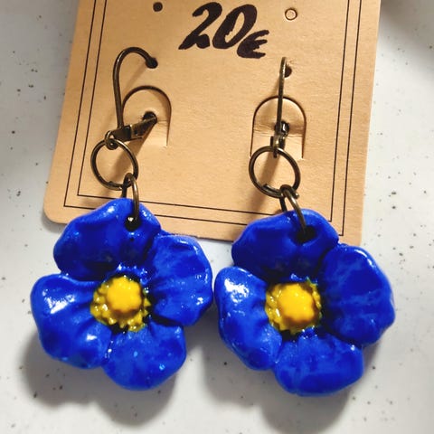 Käyttämättömät, roikkuvat sinapinkeltaiset korvakorut toivovat pääsevänsä käyttöön ja odottavat siten käyttäjäänsä. Korvakoruissa on metalliset koukkukiinnitykset.
