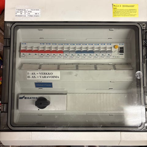 Etherma sähkökeskus valkoinen. Keskuksessa on useita johdonsuojakatkaisijoita ja vikavirtasuojia valmiiksi asennettuna. Sopii esimerkiksi kiinteistön tai tilan sähköjen jakamiseen ja suojaamiseen. Kotelo on seinään asennettava ja siinä on saranoitu etukansi, joka suojaa kytkimiä ja sulakkeita pölyltä ja kosketukselta.