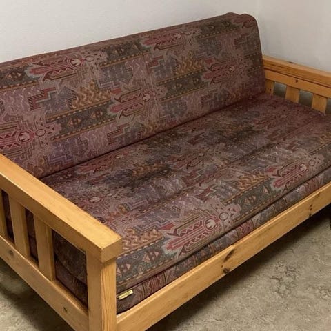 Vielä ihan ryhdikäs sohva. Tahroja löytyy ja parsittu sieltä täältä. Katso kuvat!