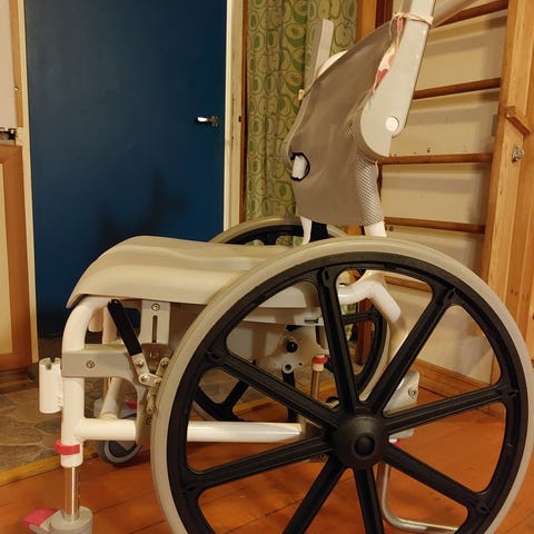 Tuoli on lähes käyttämätön. Ollut hetken kasattuna kylpyhuoneessa, muttei ole käytetty peseytymiseen lainkaan.