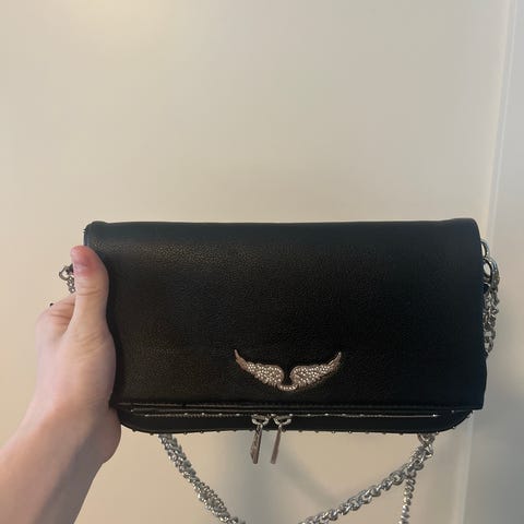 Zadig&Voltaire nahkainen olkalaukku naisille. Laukku on mustaa nahkaa ja siinä on hopeansävyinen siipilogo edessä. Laukussa on ketjuhihna, jossa on nahkainen osuus olkapäälle. Takapuolella on vetoketjutasku pikkutavaroille. Laukku sulkeutuu vetoketjulla ja läpällä, ja sisäpuolella on tilaa perusesineille, kuten puhelimelle, lompakolle ja avaimille. Sopii käytettäväksi olkalaukkuna tai crossbody-laukkuna. Siskon vanha :)