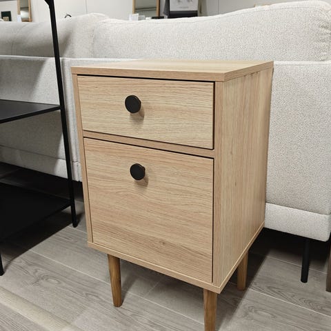 valkoiset nuppivetimillä yhdistettynä tyylikkäisiin puisiin tammi-jalkoihin luovat ylellisen ilmeen mihin tahansa huoneeseen. Ovissa olevat hidastavat soft-close saranat takaavat hiljaisen ja pehmeän sulkeutumisen, mikä lisää käyttömukavuutta.