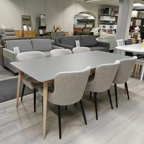 Kaunis Rowico Dawsone suorakulmainen jatkettava ruokapöytä 90 x 200 cm + 45 cm on tukeva ja massiivinen. Dawsone -pöytää voi jatkaa 45 cm mukana tulevalla jatkopalalla. Pöydän runko on tammea ja pöytälevy harmaata korkeapaine laminaattia, joka on kovaa käyttöä kestävä pintamateriaali.
