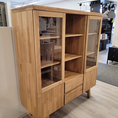 Tilava lasivitriini Filippa-mallistosta sopii kodin oleskelu- ja ruokailutiloihin. Vitriinin levenevät viistomaiset jalat keventävät ulkoasua ja tuovat siihen samalla ripauksen moderniutta. Filippa-vitriinissä on pehmeästi sulkeutuvat laatikot ja ovet, jotka vaimentavat ääntä ja estävät naarmuuntumista. Vitriinin yläosassa on kauniit puukehyksiset lasiovet lasihyllyillä ja alaosassa kaksi laatikkoa, missä paljon säilytystilaa astioille tai koriste-esineille.