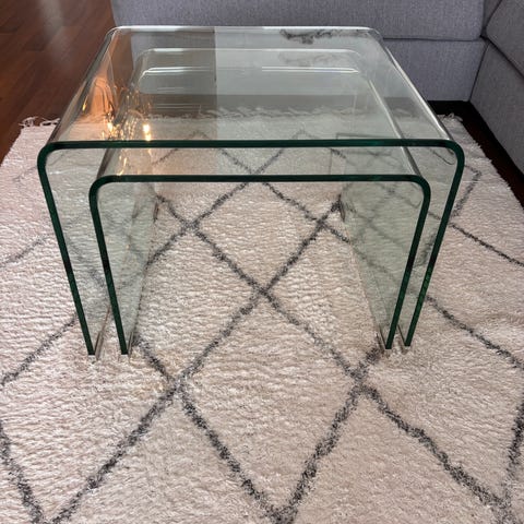 Isompi pöytä 50 x 50 x k 36 ja pienempi 45 x 45 x k 31 cm. Lasin paksuus 8 mm. Metalliset jalat. Lasit pysyvät paikoillaan silikonitapeilla. Vain nouto Espoosta, voidaan sopia Tampereelle tuonnista pientä korvausta vastaan.