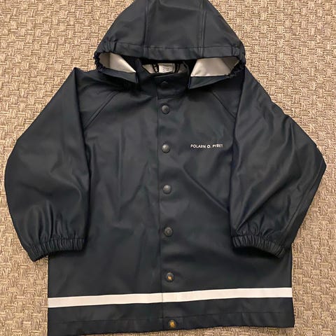 Polarn O. Pyret sadehousut lapsille. Koko 98 cm, sopii noin 2–4-vuotiaille. Väri sininen. Materiaali polyesteriä. Housuissa on säädettävät olkaimet, joustava vyötärö ja lahkeensuut sekä heijastinnauhat